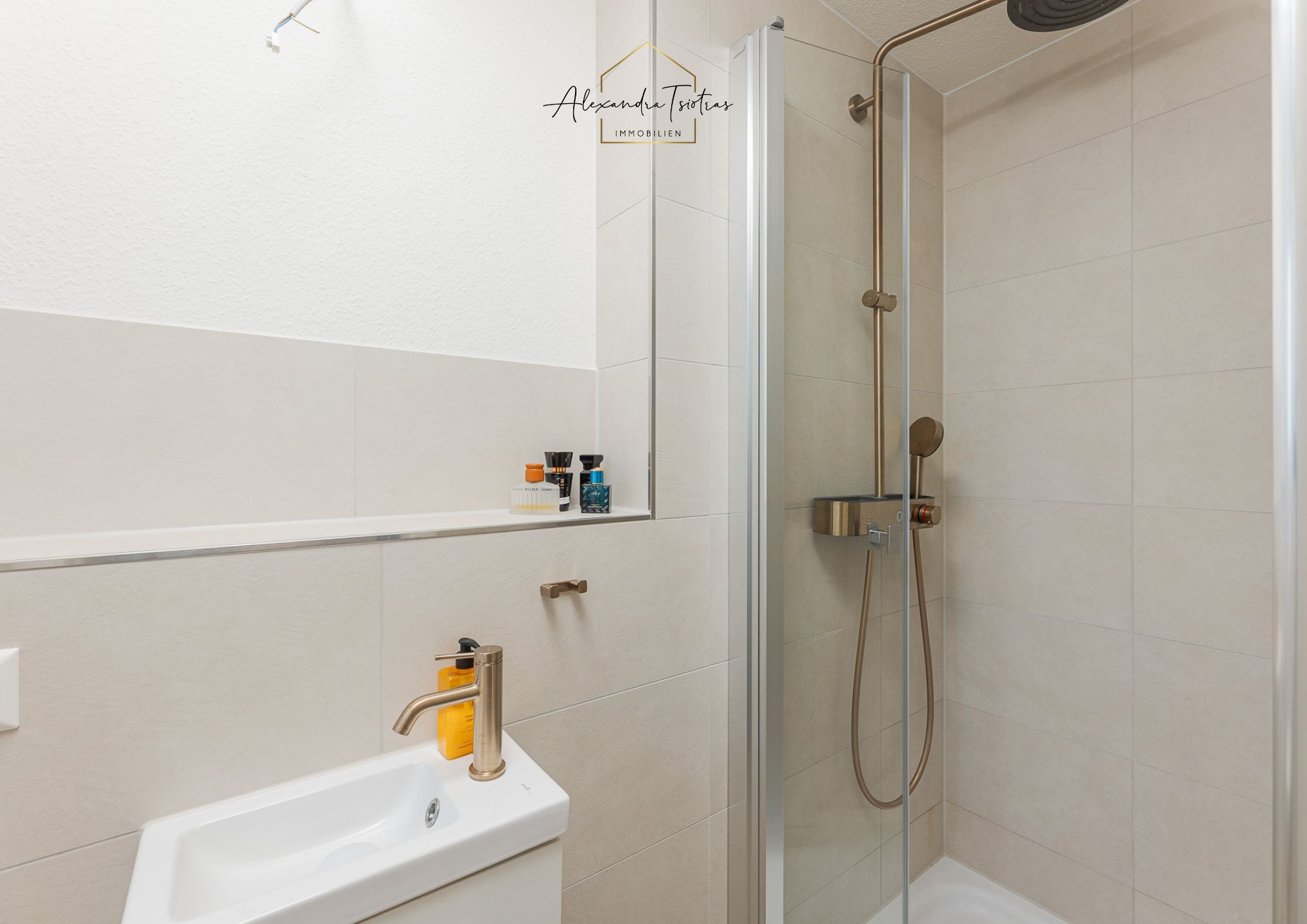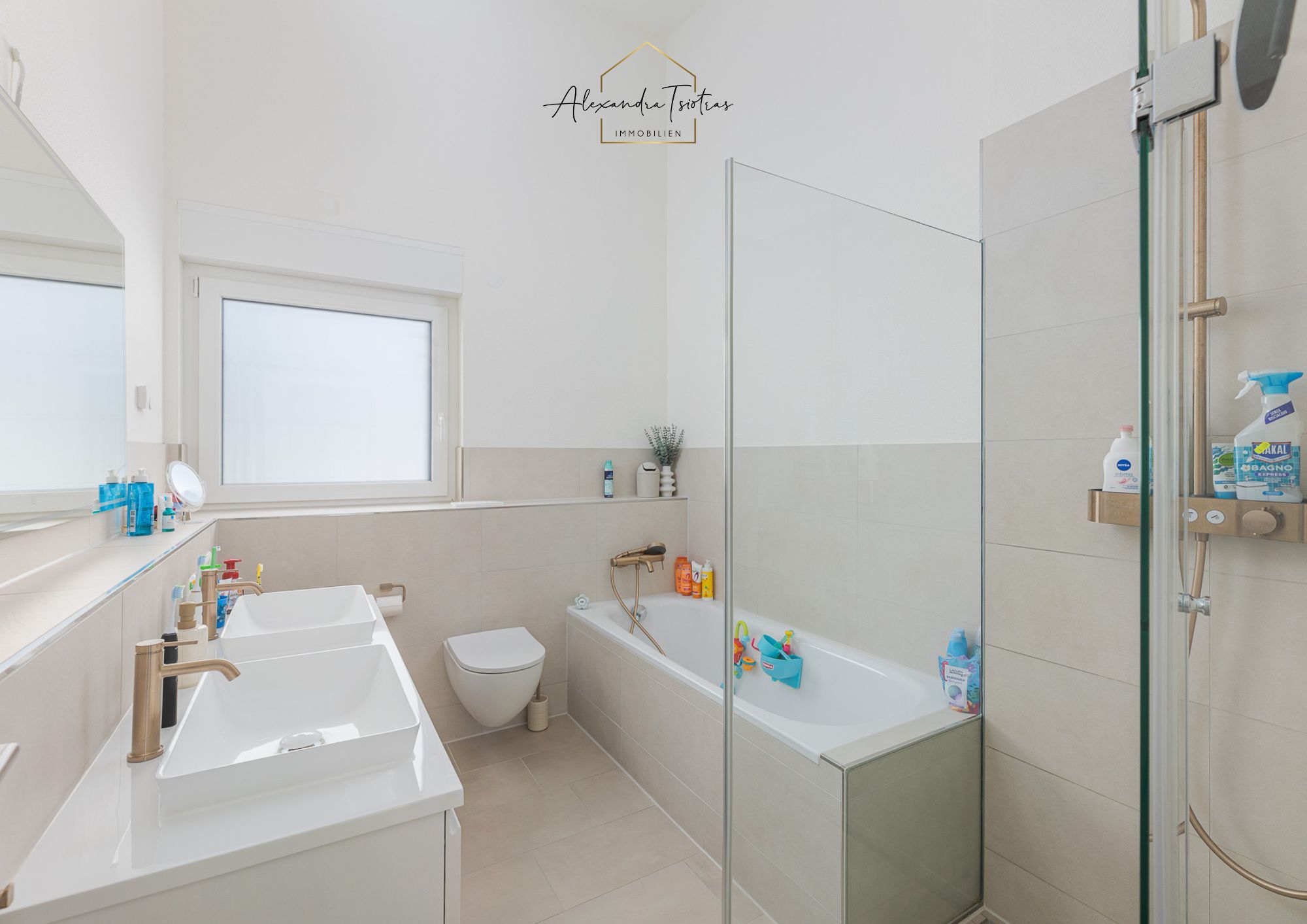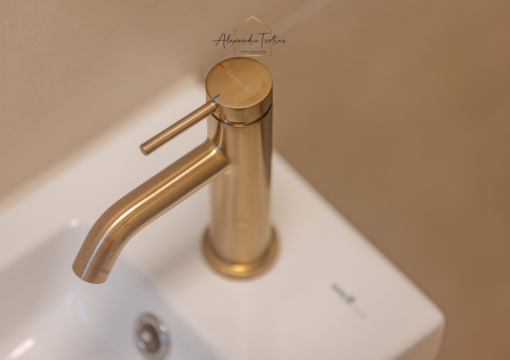 Doch fangen wir zuerst mal im Bad an. Hier steht Ihnen alles zur Verfügung, was Sie als Familie benötigen. Zwei Waschbecken, ein WC, eine Badewanne und eine Dusche. Die hochwertigen goldfarbenen Armaturen von Hansgrohe setzen stilvolle Akzente und sind ein echter Blickfang im Bad.