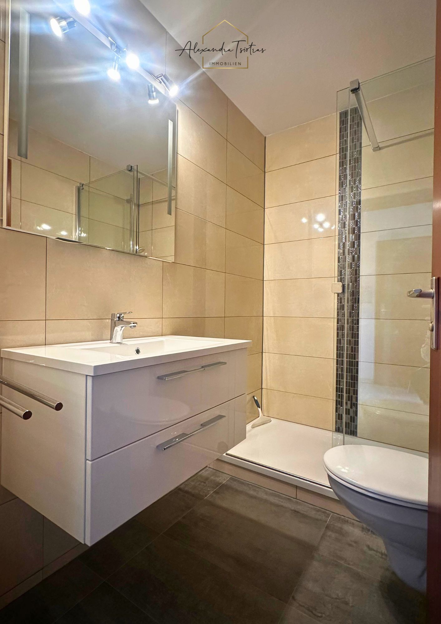 Ein Schlafzimmer sowie das moderne, innenliegende Bad mit Dusche vervollständigen das Raumangebot.